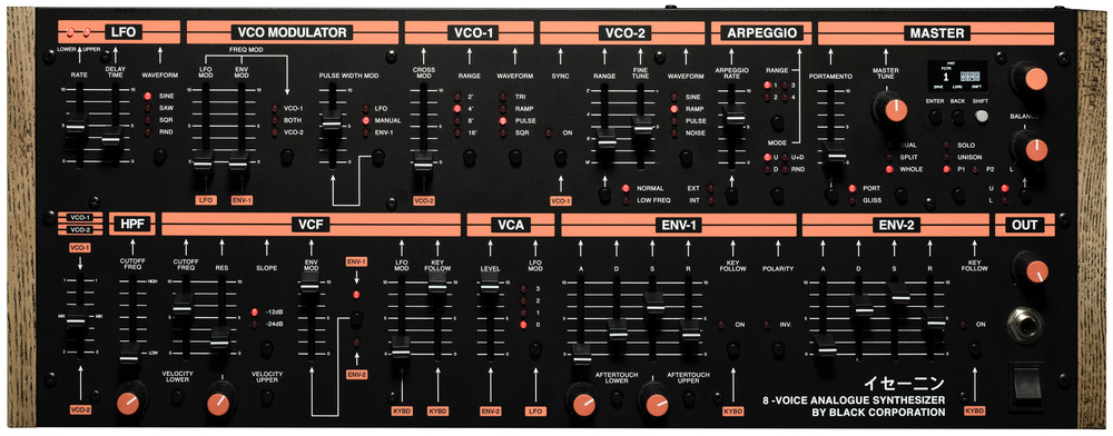 In the upper row of controls, the two VCOs per voice offer the same range of waveforms and footages as the Jupiter‑8, with the same PWM, cross‑modulation, sync and VCO2 low‑frequency options. Likewise, the LFO and VCO Modulator are reproduced correctly. The first significant differences appear to lie in the arpeggiator controls but, despite the visual changes and the apparent loss of the Hold and Latch functions (which have migrated to combinations of buttons), its function is largely unchanged. Hmm... that isn’t quite right. Arpeggios on the ISE‑NIN are velocity sensitive, you can choose two patterns simultaneously (one for Upper and one for Lower), they can have separate rates, and you can synchronise them to MIDI Clock.