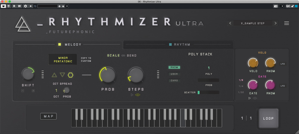 And, if you want to experiment with some chord generation, the new Poly Stack feature provides for that possibility also with some interesting options for defining your own chord voicings. Finally, you can configure the Loop option, which allows you to essentially capture a short sequence of Rhythmizer’s note randomisation process and then loop it for as long as the Loop button is engaged.