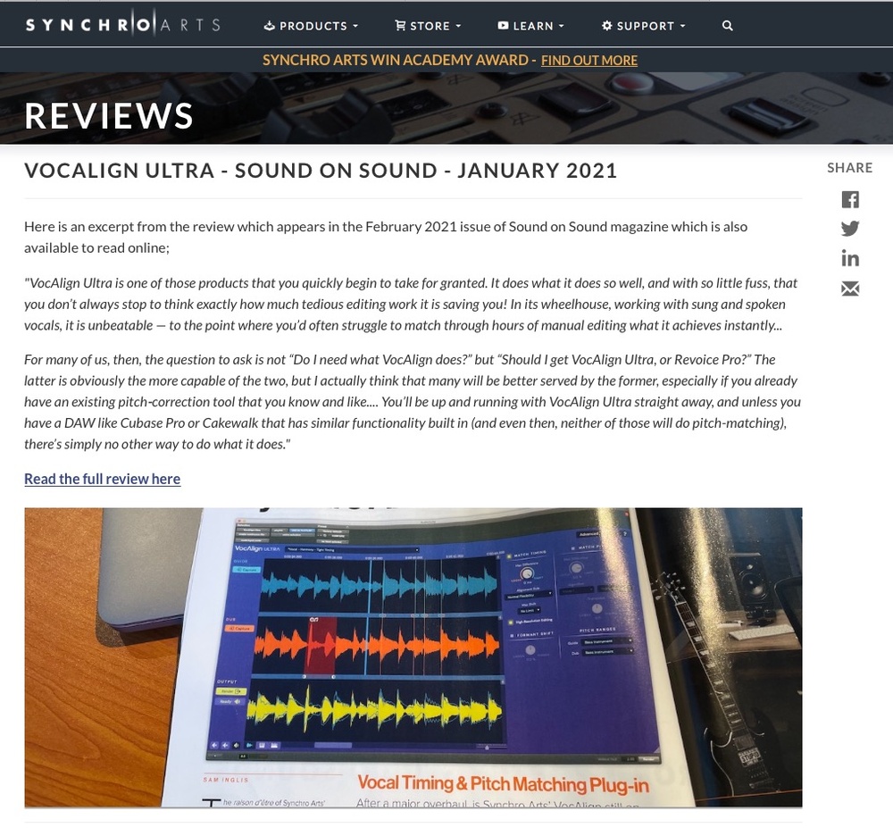 SOS review quotes on the Synchro Arts website with Magazine name, Month/Year plus link to full SOS review on our website. The use of a photo of the mag is a nice touch and shows the article author's name.