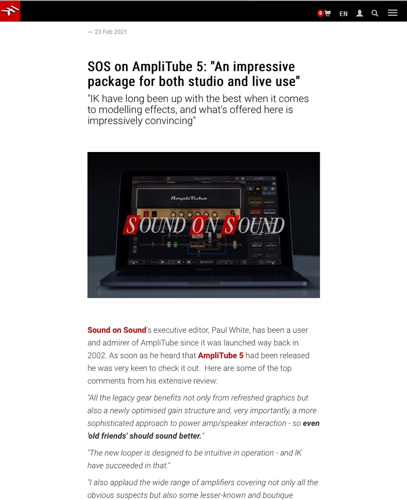 IK AmpliTube 5 SOS review quotes, SOS logo and scroll down it shows the full Review link.