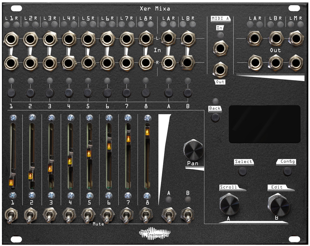 ‘A step out?’ I hear you ask. Well, believe it or not, the Xer Mixa is not only the biggest Noise Engineering module yet, measuring a rack‑hungry 32HP, it’s also the very first to include a screen. This may come as a surprise, mainly because of Noise Engineering’s stellar track record in the realm of digital — both hardware and software — and the strident design ethos underpinning the multifaceted (and essentially endless) Versio, Legio and Alia platforms. If you’re not familiar with those then I’d highly recommend a visit to Noise Engineering’s website to find out more.