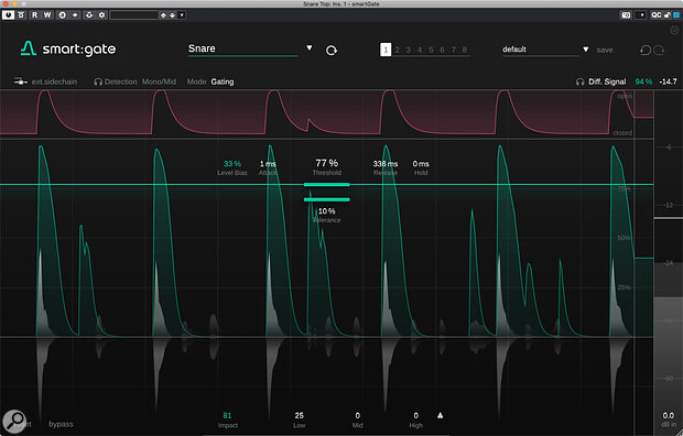 One thing smart:gate offers that’s out of the ordinary is a ‘content aware’ mode. As shown in the main screenshot, Sonible provide a number of common target profiles, and once you’ve selected one of these the plug‑in analyses a short section of the incoming audio. It attempts to identify, within that input signal, a match for the selected target and then configure initial settings — once done, the gate should open only when the level of the selected target exceeds the threshold. Other sound elements within the signal will not trigger the gate. And for many sources, this might be all that’s required.