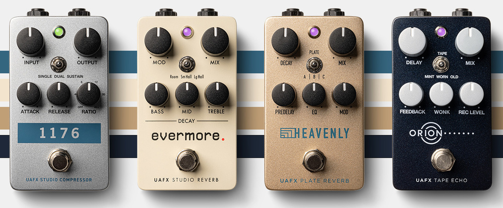 The ever‑growing UAFX stompbox line‑up now includes a range of more affordable single‑function digital pedals: 1176 Studio Compressor, Orion Tape Echo, Heavenly Plate Reverb and Evermore Studio Reverb.